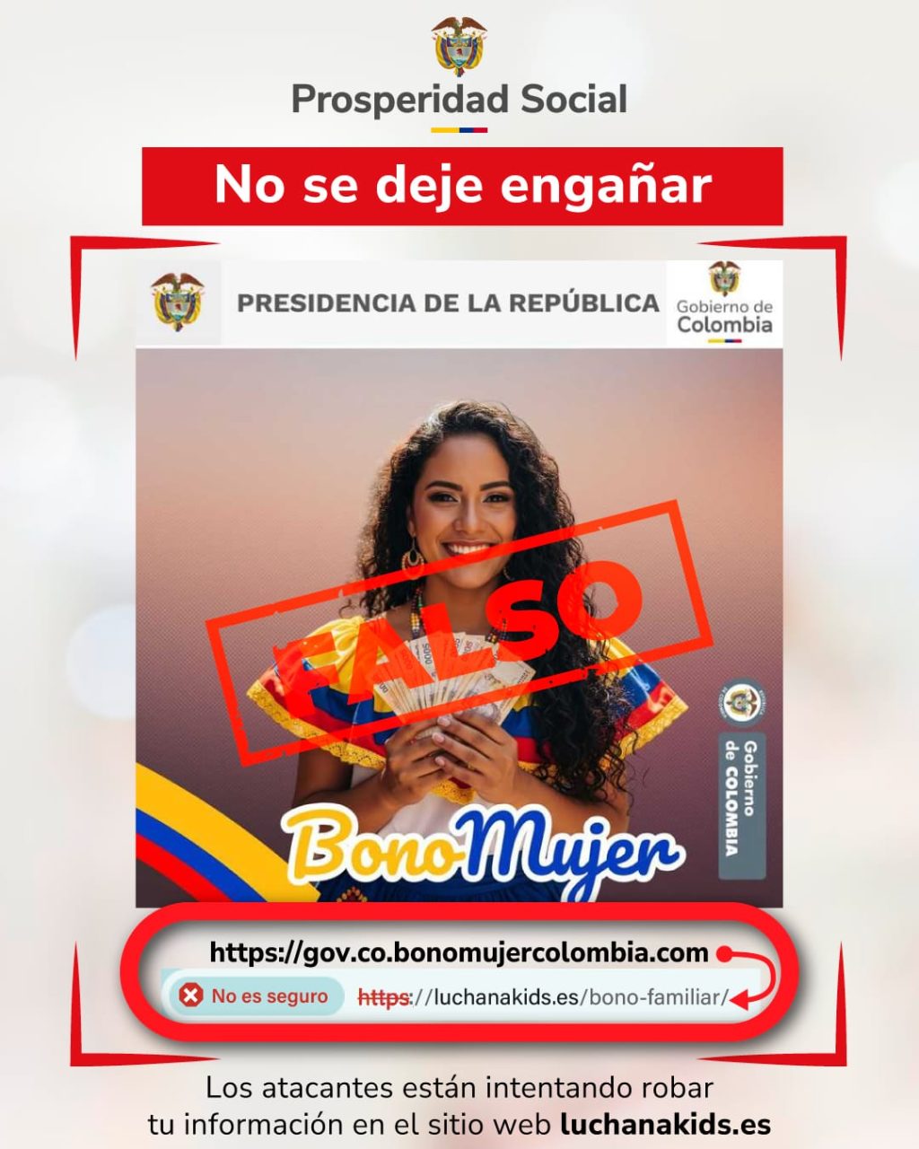 Bogotá D.C., 19 de julio de 2025 – El Departamento de Prosperidad Social alertó a la ciudadanía sobre una publicación falsa que circula en redes sociales y otras plataformas digitales, en la que se promociona un inexistente “Bono Mujer de $850.000”, supuestamente dirigido a mujeres mayores de 18 años en todo el país.